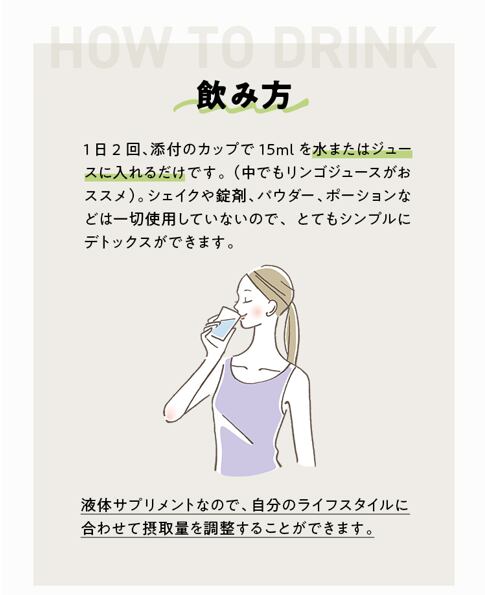 1日2〜3回、毎食前に飲むだけ(1クール16日間)。いつもの生活にプラスするだけで、手軽に自然なデトックスを始められます。