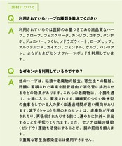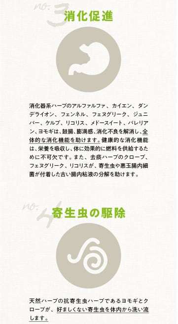 クローブ / フェヌグリーク / カンゾウ / ゴボウ / タンポポ / ジュニパー / スギナ / メドウスイート / ローズヒップ / アルファルファ / カイエン / フェンネル / ケルプ / バレリアン / ヨモギ / センナ