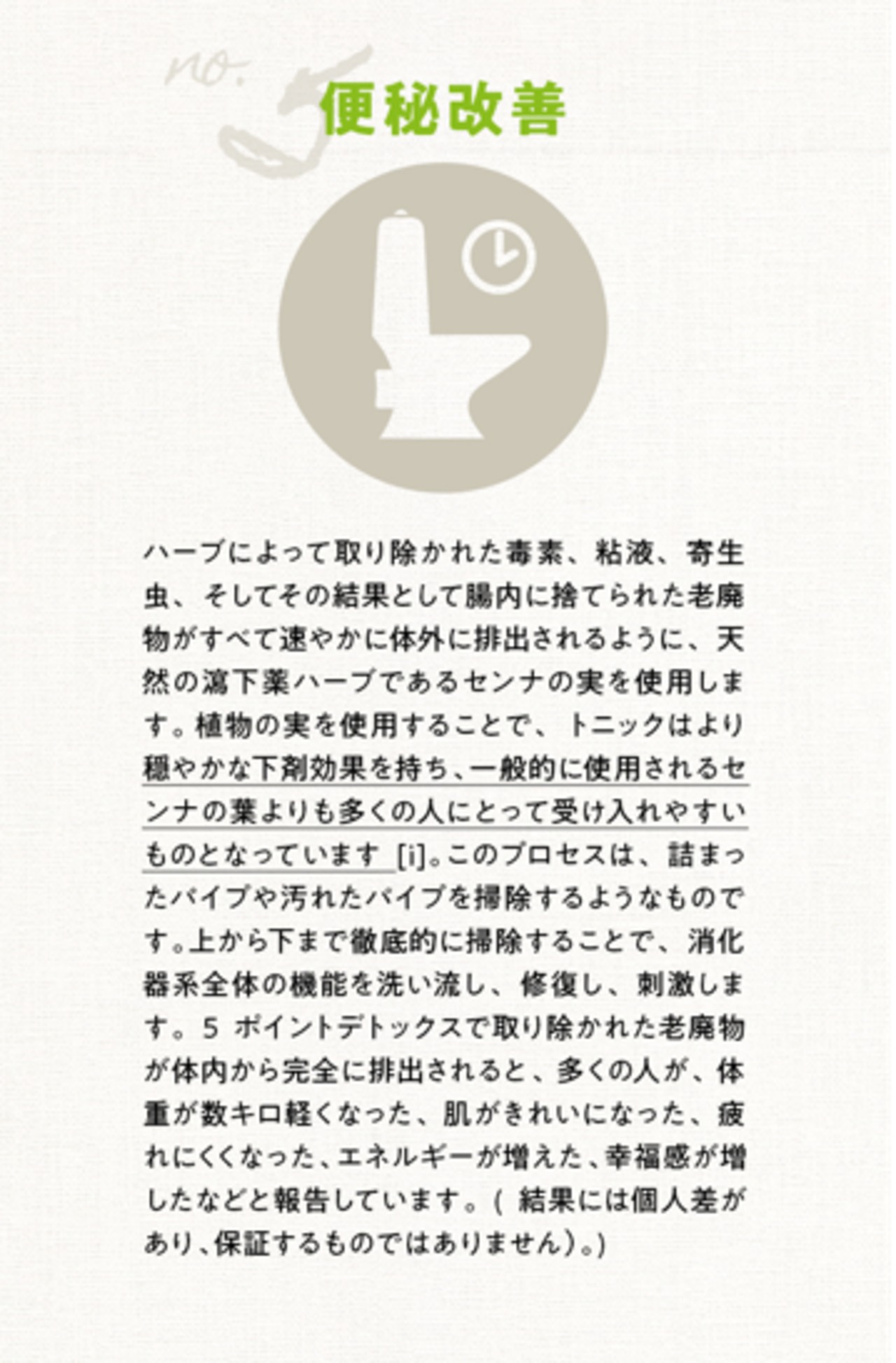 ・1クール「16日間」でのご使用を推奨しています。人間本来の排出機能を保つため、16日を超える連続使用はお控えください。