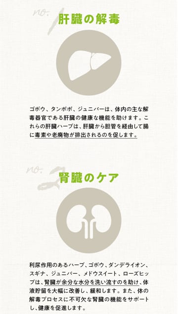 クローブ / フェヌグリーク / カンゾウ / ゴボウ / タンポポ / ジュニパー / スギナ / メドウスイート / ローズヒップ / アルファルファ / カイエン / フェンネル / ケルプ / バレリアン / ヨモギ / センナ